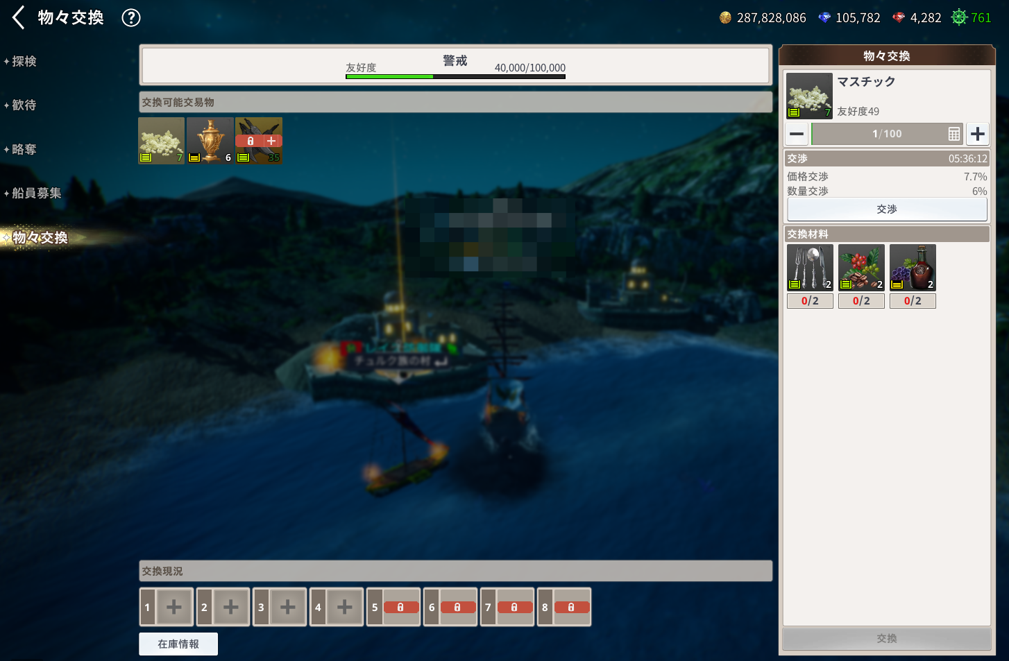 また、物々交換に関する数値は村の在庫状態、艦隊の交換戦略LV、航海士効果などの影響を受けます。